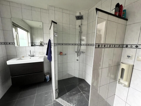 overloop, 3 slaapkamers, badkamer met douche en wastafel.